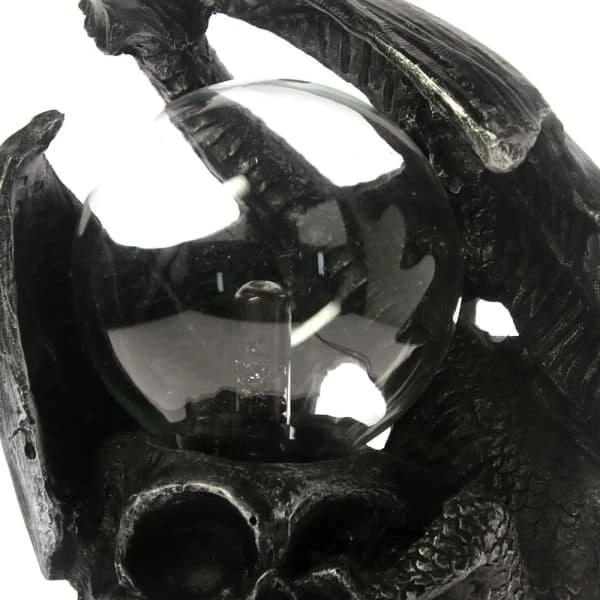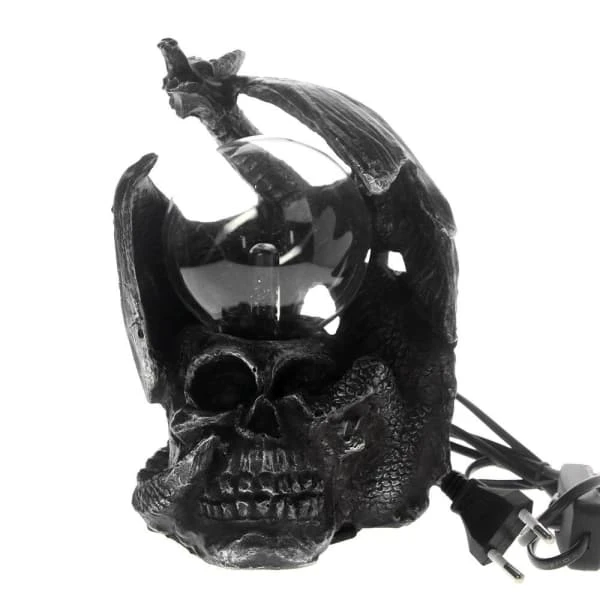 Get a beautiful and decorative plasma bulb placed on the head of a skull, surrounded by a dragon to his home. The harmless lightning discharge on the inside of the 80mm large glass ball and it becomes a skull lamp gothic dragon. If you touch the ball, the rays focus on the ball surface.