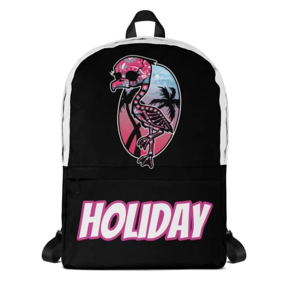 This sturdy, vintage-style Holiday text Backpack is made of polyester and features a cute flamingo skull with pink feather accents. It has a spacious main compartment with an inside zippered pocket and a side zippered pocket. The adjustable shoulder straps are padded for comfort.