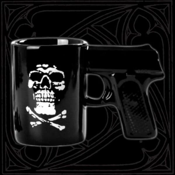 Get this Aggressive Gun Mug and drink the violence. Just kidding get this item it can be a great item for decor and for use as well.Â