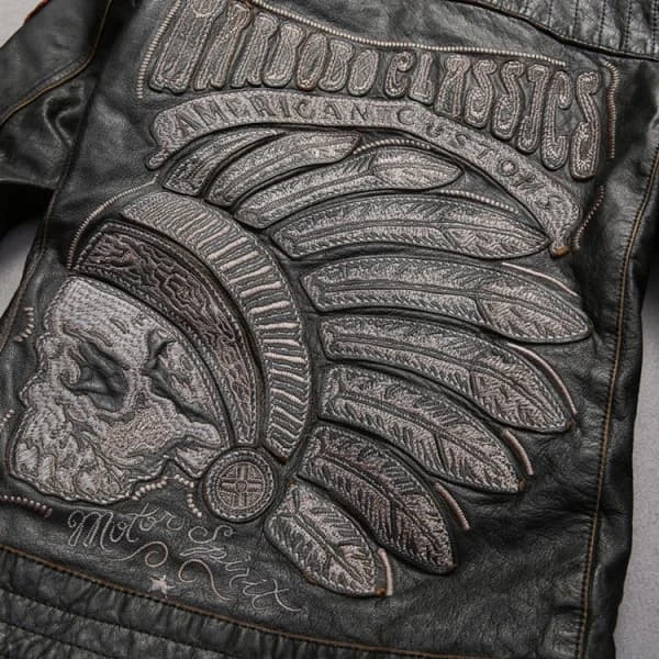 Winter is fast approaching and why not keep warm and stay out of the cold by wearing this Heavy Indian Skull Jacket. Featuring an elegant and classic design, this jacket will add a touch of originality to your look. The fabric is of excellent quality and the design is very long-lasting. The design on the back is very good looking. Indian skull leather is handcrafted from the head of a cow or buffalo, after the animal has been killed for food. The leather is tanned using vegetable oils and then cut into small pieces. It is then dyed and painted with traditional Indian designs.Â