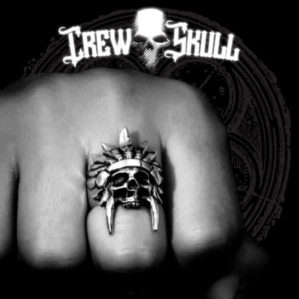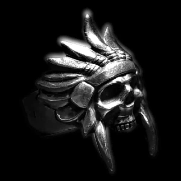 The Indian Skull Ring is made of stainless steel and includes a carved skull design with a native feathered warbonnet. Each warbonnet feather is acquired with acts of courage and benevolence, and it is regarded as a mystical and magical artifact with the ability to defend the wearer in combat. This ring has exceptional tribal intricacy sculpted by our master Silversmith and displays an Indian skull face with a finely created design.