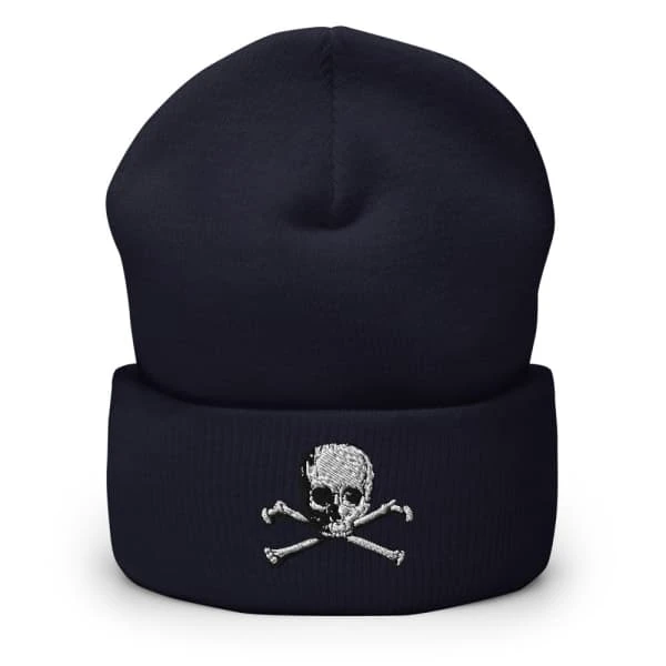 A snug, form-fitting Skull and Crossbones Beanie. It’s not only a great head-warming piece but a staple accessory in anyone’s wardrobe. The Skull Beanie is the perfect hat for those who want to show their pirate pride. This hat features a white skull and crossbones on the front, with a black background. It is made of 100% acrylic yarn.