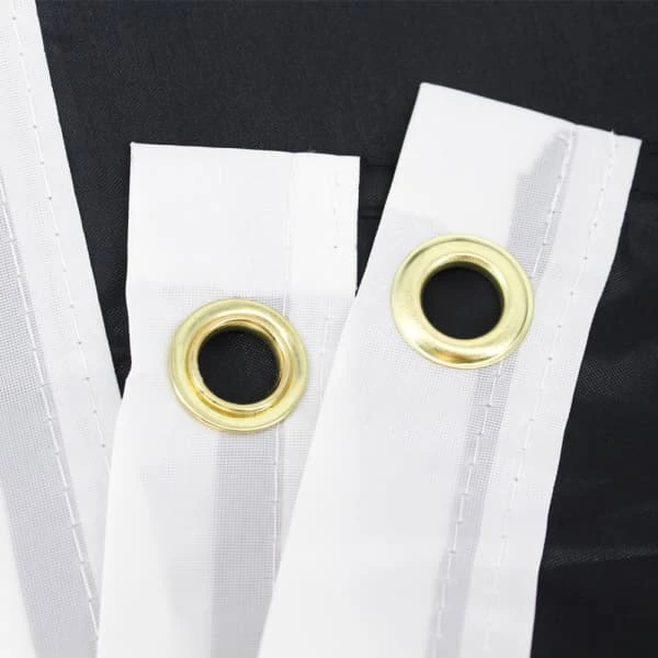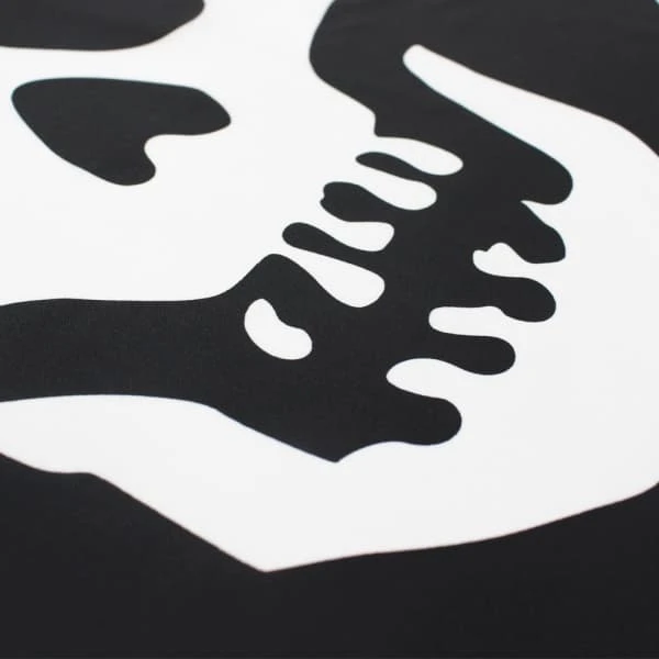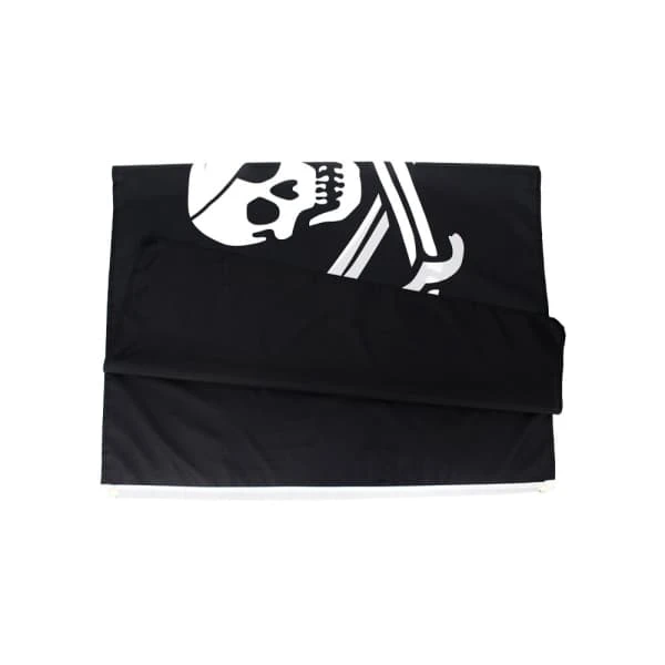 This is a flag with a skull and crossbones on it. It is a black and white flag with a skull and crossbones on it. It has a black background with a white skull and crossbones. The skull and crossbones are in a traditional pirate style. The skull has an eye patch and an evil grim on the face. Get this Skull and Crossbones Flag today and enjoy the pirate vibe.Â