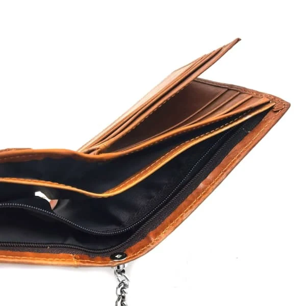 The skull biker wallet is made of 100%Â leather and is the perfect accessory for your next biker rally. The wallet features a black polyester exterior with a front zipper pocket, an interior with slots for credit cards, and a back zipper pocket for your cash. The inside of the wallet is bright and bold which will make you stand out in a crowd.