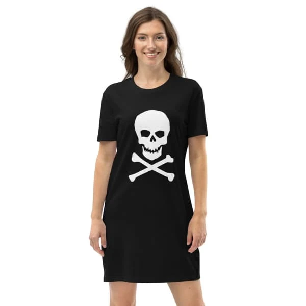 This is a cute skull dress with a skull and crossbones design. It is perfect for any lady who wants to show off her fun side. The skull and crossbones dress is made of 100% organic ring-spun cotton material and is available in different sizes.
