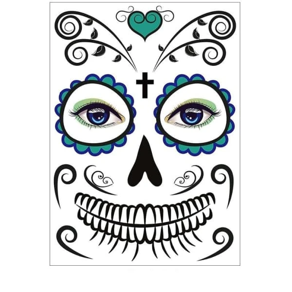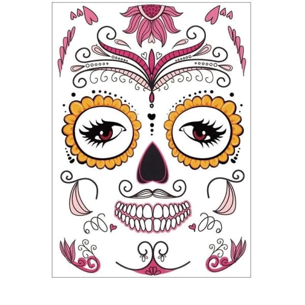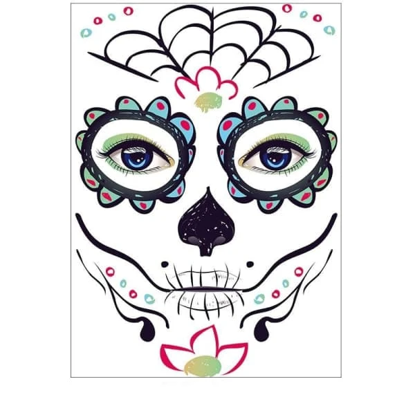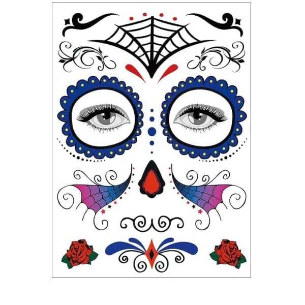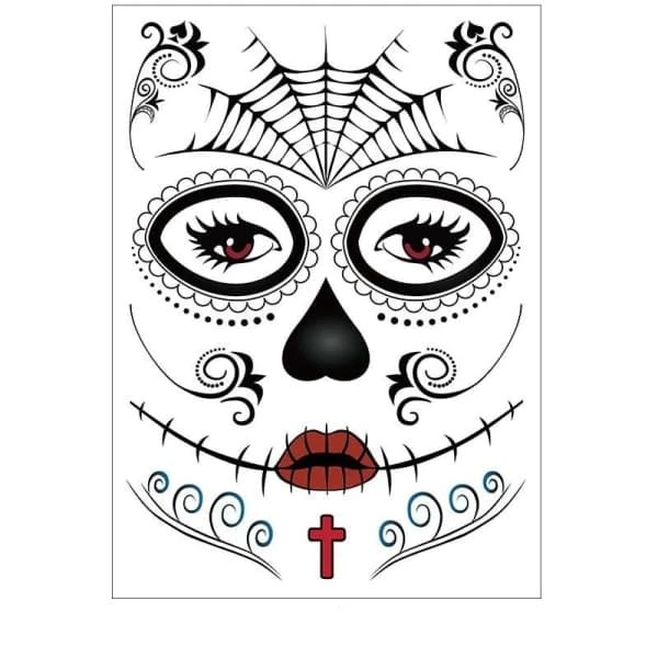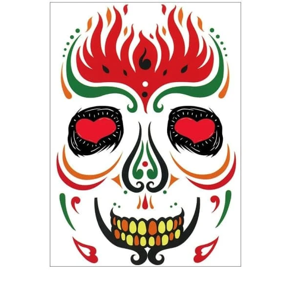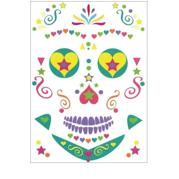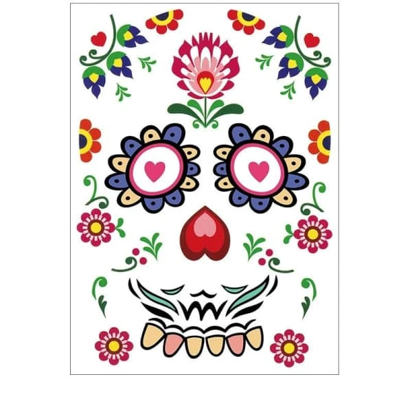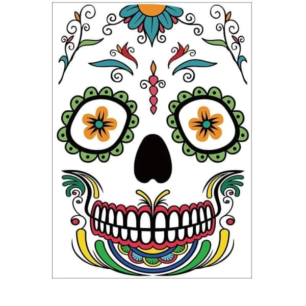Sugar Skull Full Face Temporary Tattoo This is a great temporary tattoo for the person who wants to look festive for the Day of the Dead, or for anyone who loves skulls. The Sugar Skull Full Face Temporary Tattoo is a black and white design. This tattoo is waterproof and is easily removed with soap and water but recommended to remove it with baby oil or alcohol.