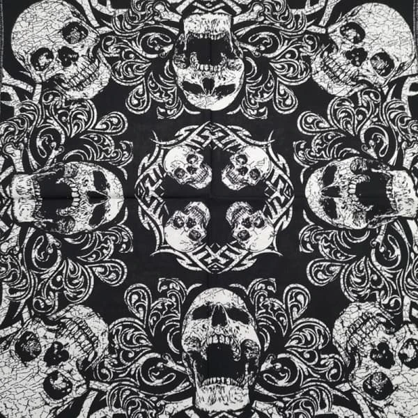 Tribal Skull Bandana Wearers of this bandana will show their wild side with a modern twist. The bandana is made of cotton and features a tribal skull design in black and white. The bandana is one size fits all and is available in various colors. The performance of this bandana is very good and it is of satisfactory quality. Purchase this bandana before it leaves stock as it is particularly on request.Â